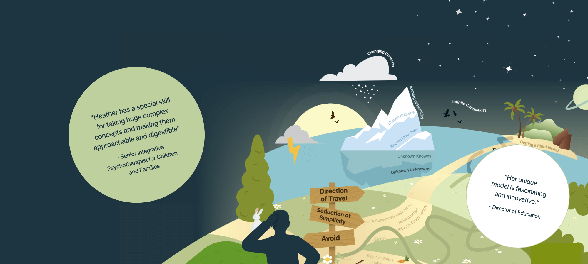 Partnering then involves a continued relationship where Heather can support in bespoke ways as the journey through the 4 Stages (see above) develops and she will offer her unique ‘Map’ as a tool for anchoring and scaffolding the journey (see ‘Heather’s Map as a framework’ section).
